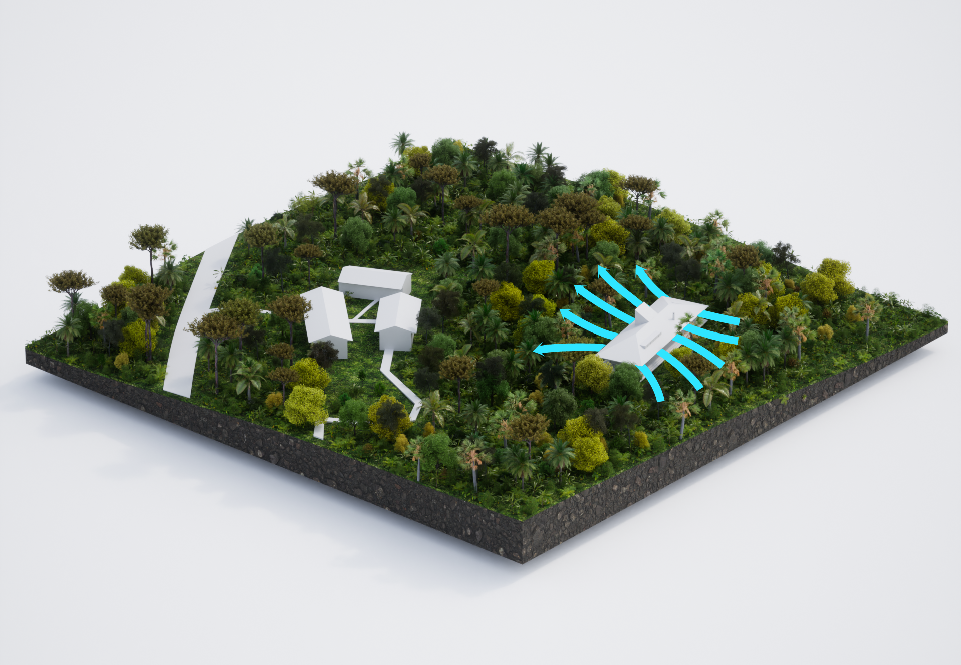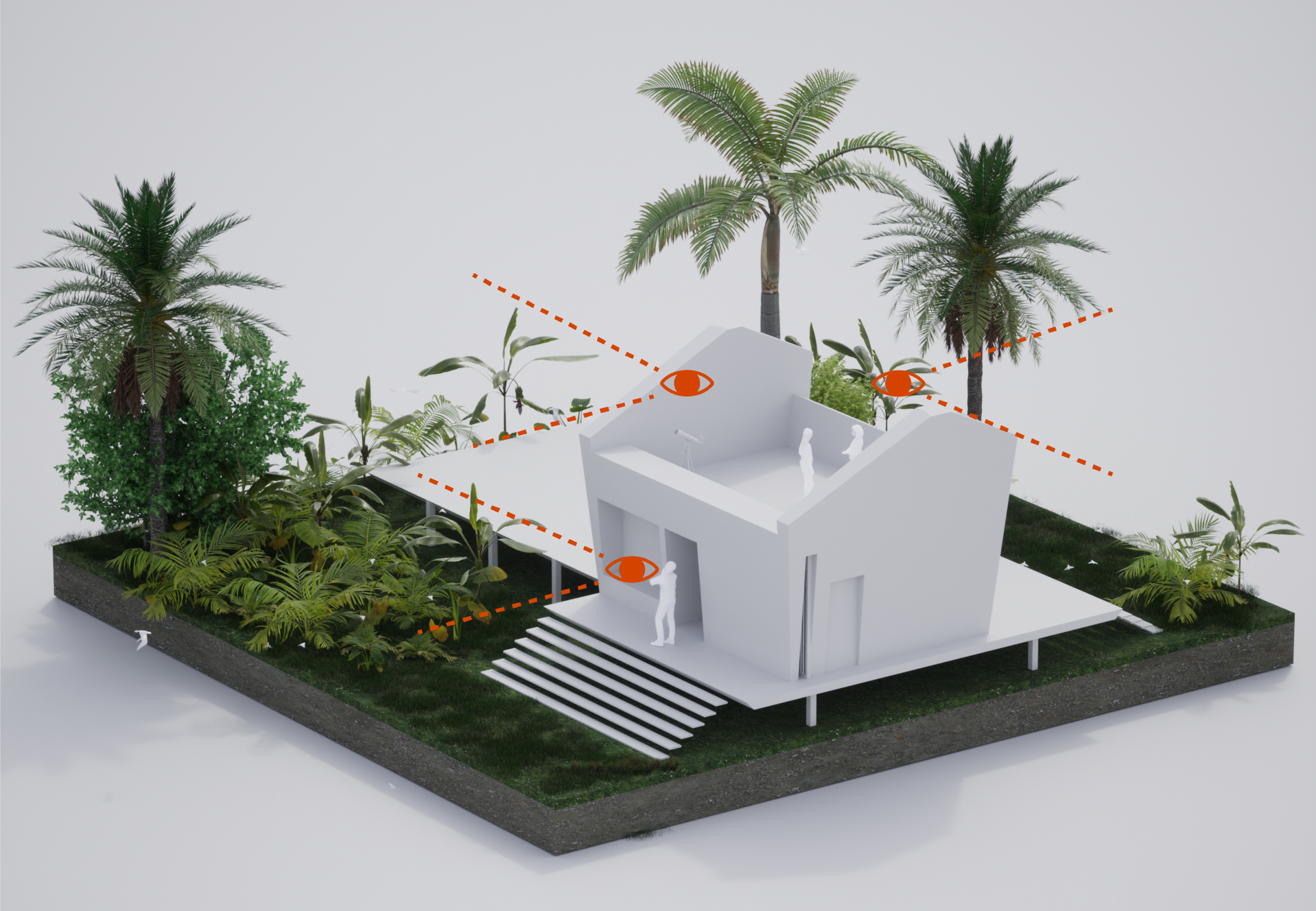 Un objetivo clave de la propuesta será seguir desarrollando maneras de crear hábitats apropiados tanto para los humanos como para la fauna, y esperamos colaborar en el futuro con los biólogos y observadores de aves de FMU y nuestro equipo. Tras numerosas excursiones de campo, comprendemos que, por lo general, la mejor manera de aprender sobre otro ser es observarlo con sensibilidad en su contexto. Creemos que esta conexión crucial debe ser parte integral de la conceptualización de la arquitectura creada. Al reutilizar espacios restringidos, como las áreas de almacenamiento, como plataformas para cambiar nuestra relación vertical dentro del bosque, creemos que esta propuesta comienza a establecer nuestra intención de crear un refugio orientado al exterior.
