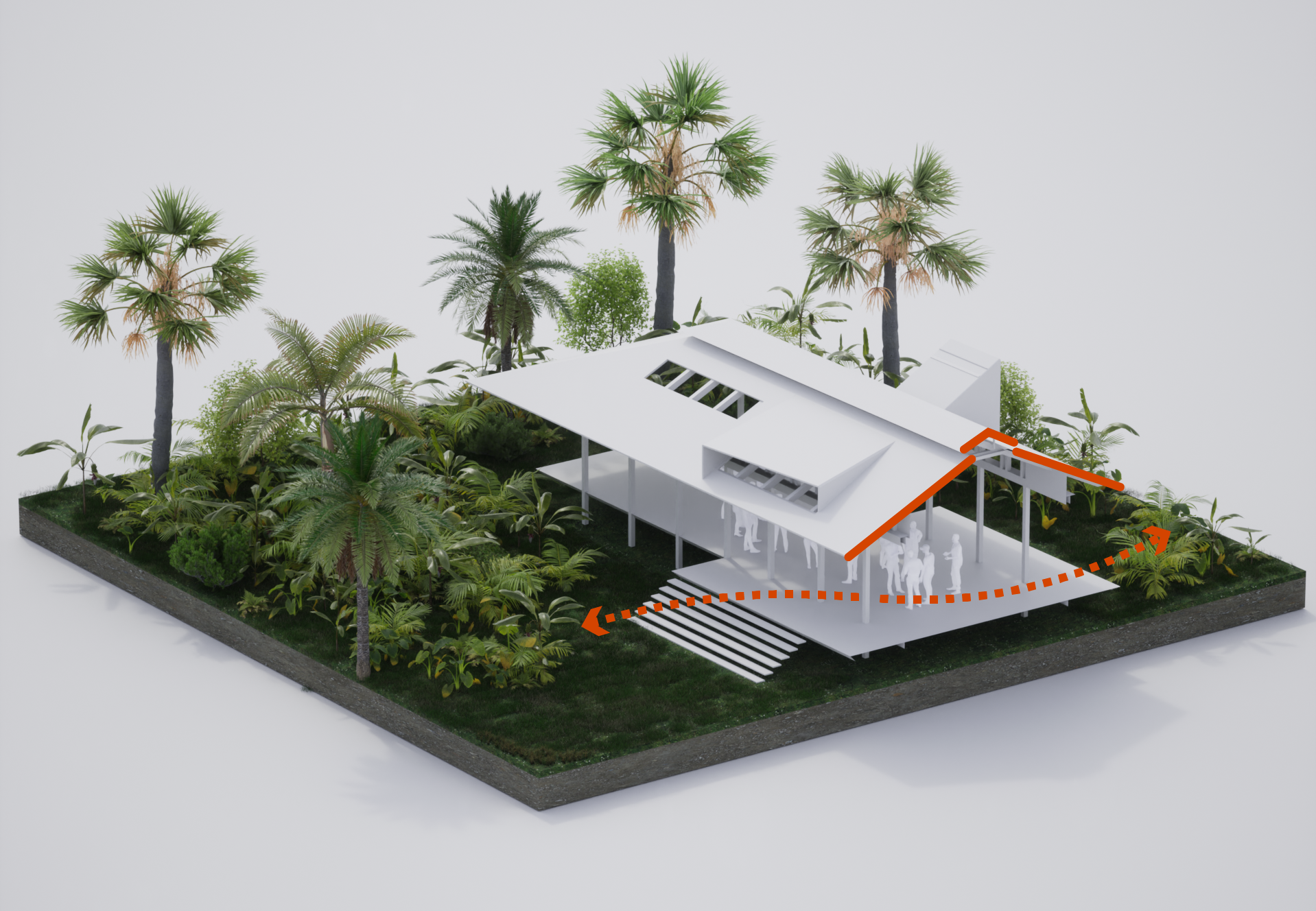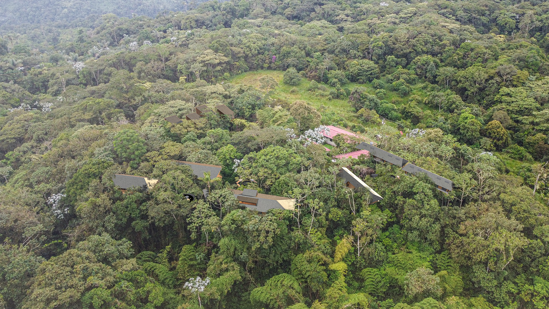 Este esfuerzo no es una mera fantasía visual; al interactuar con el bosque en cada etapa de nuestro proceso de construcción, seguiremos descubriendo nuevas formas de crear espacios que se basen en la interacción tanto de los humanos como de la fauna. Estos edificios deben estar preparados para ser edificios vivos, independientemente de los sistemas de protección que implementemos durante los largos periodos en que el campus no esté en uso por parte de FMU. Si algunas secciones de estos edificios se pueden cerrar y abrir fácilmente e incluso formar una parte útil de la infraestructura al servicio de los observadores de aves que se alojan en Wild Sumaco Lodge, podemos seguir desarrollando la práctica de la administración comunitaria. Estos fuertes lazos de beneficio mutuo son fundamentales para la supervivencia dentro de la selva tropical y para la supervivencia de la selva tropical misma.