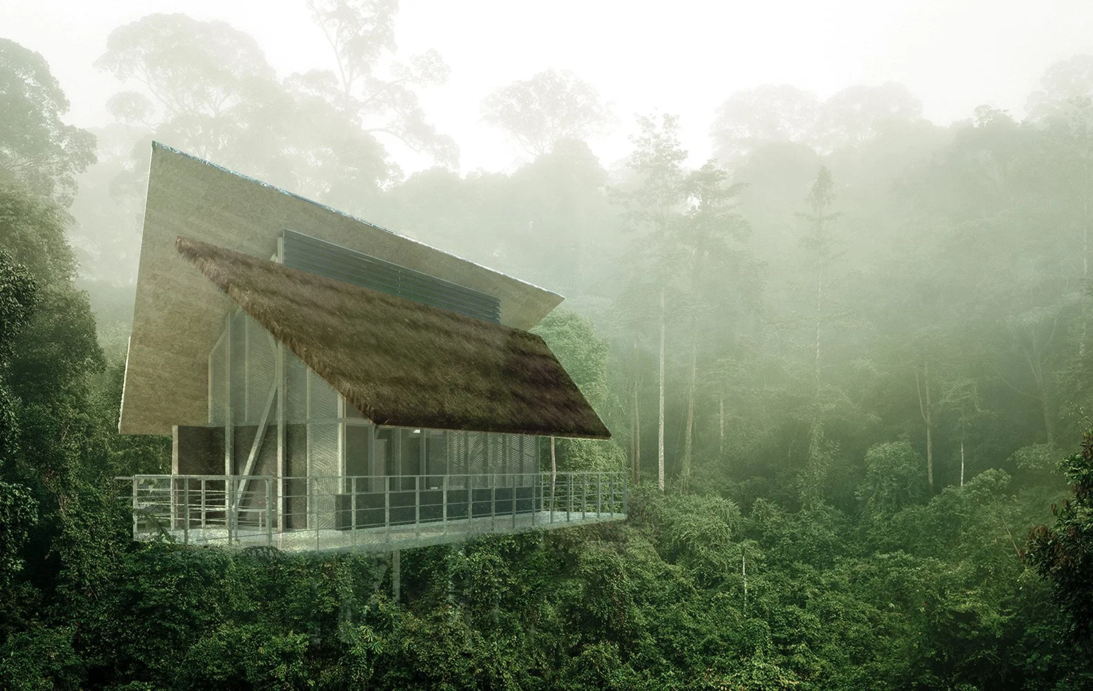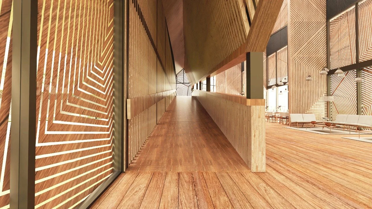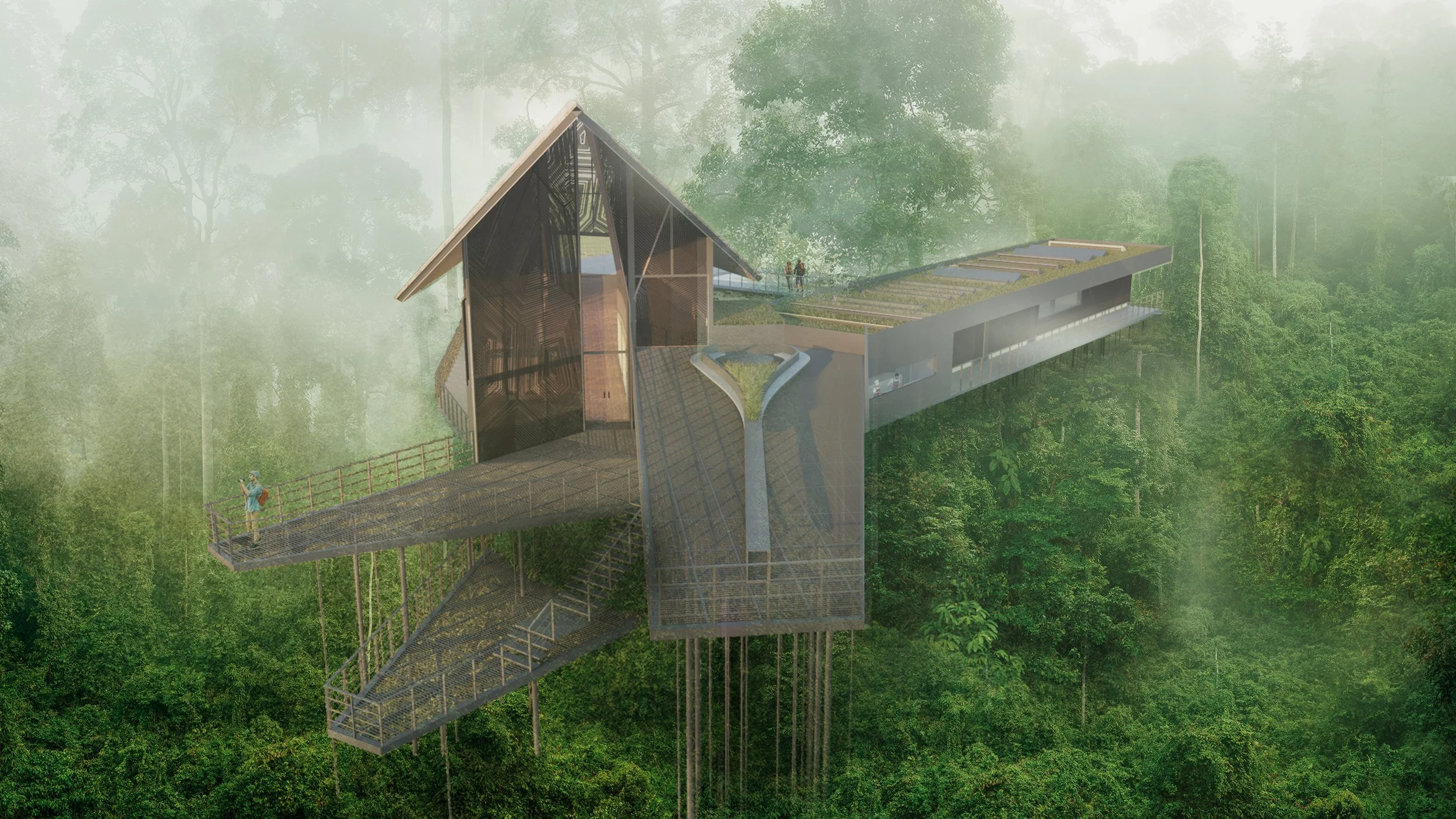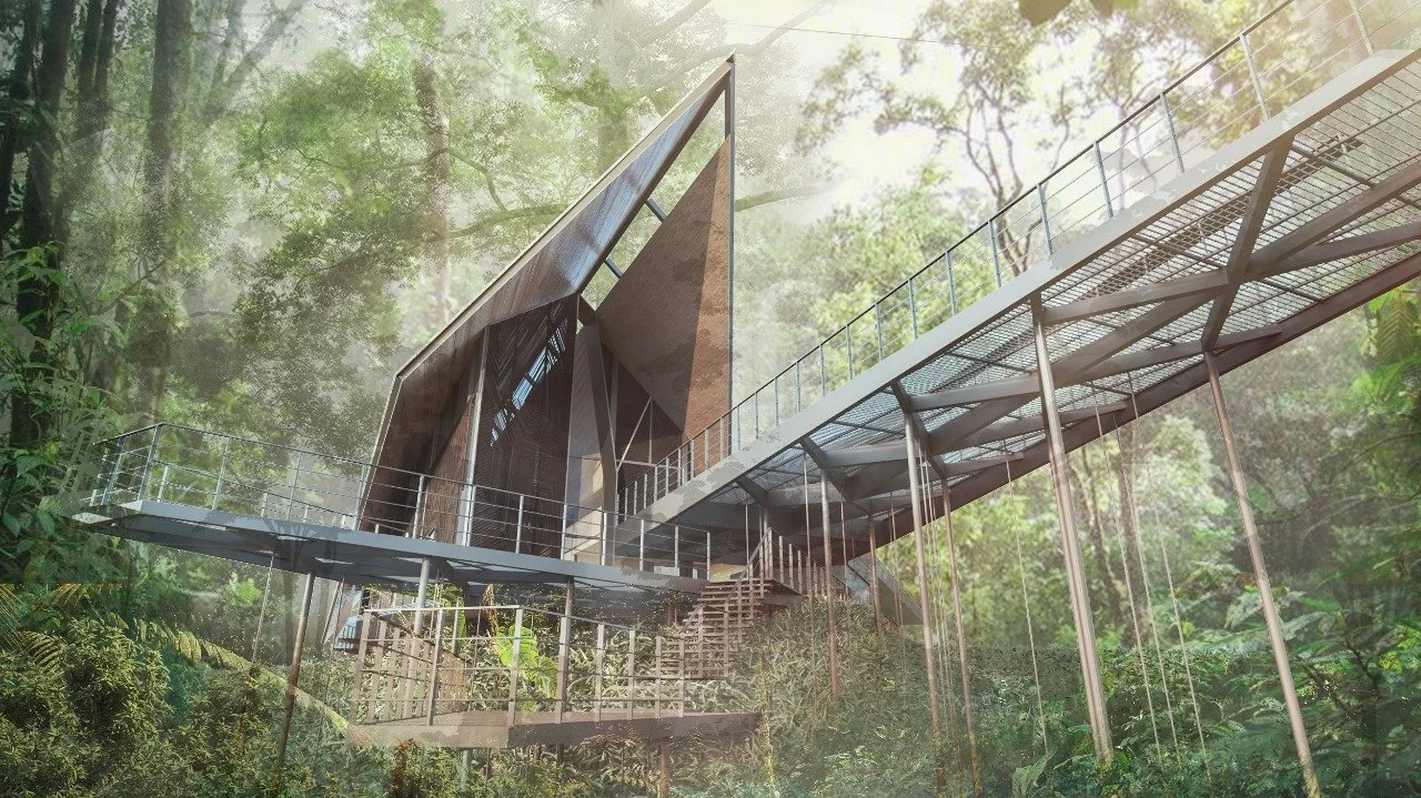 En términos de construcción, el diseño utiliza materiales sostenibles y respetuosos con el medio ambiente, como tubos de perforación petrolera reciclados para la estructura, y madera y palma real para las cubiertas. Esta elección de materiales refleja un enfoque consciente hacia la reutilización de recursos y la integración del proyecto en su entorno natural, manteniendo un equilibrio entre la innovación arquitectónica y la preservación del paisaje amazónico.