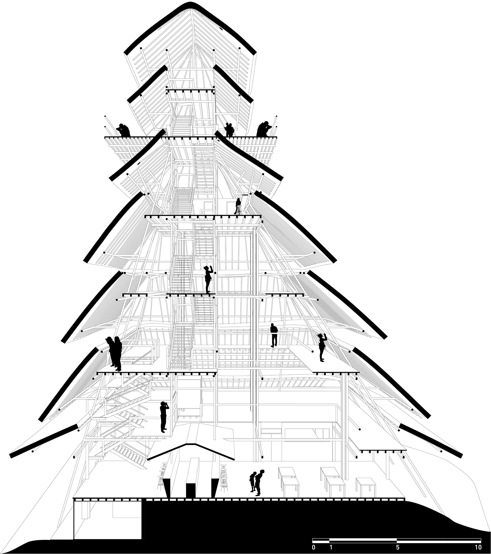 El resultado es una torre de más de 2600 m2 en 7 plantas, con estructura mixta de madera local y tubos de perforación petrolera reciclados. Las columnas compuestas redujeron significativamente el uso de materiales, logrando la torre de madera más alta de la Amazonia ecuatoriana. Los tubos reciclados ofrecen resistencia sísmica y se adaptan a fuertes vientos. Las cubiertas de paja toquilla y palma real, con más de 20 años de vida útil, proporcionan vistas panorámicasen cada nivel. Este proyecto representó un logro destacado y un orgullo para la comunidad, generando ingresos económicos y demostrando la viabilidad de vivir modernamente sin perder tradiciones ancestrales.