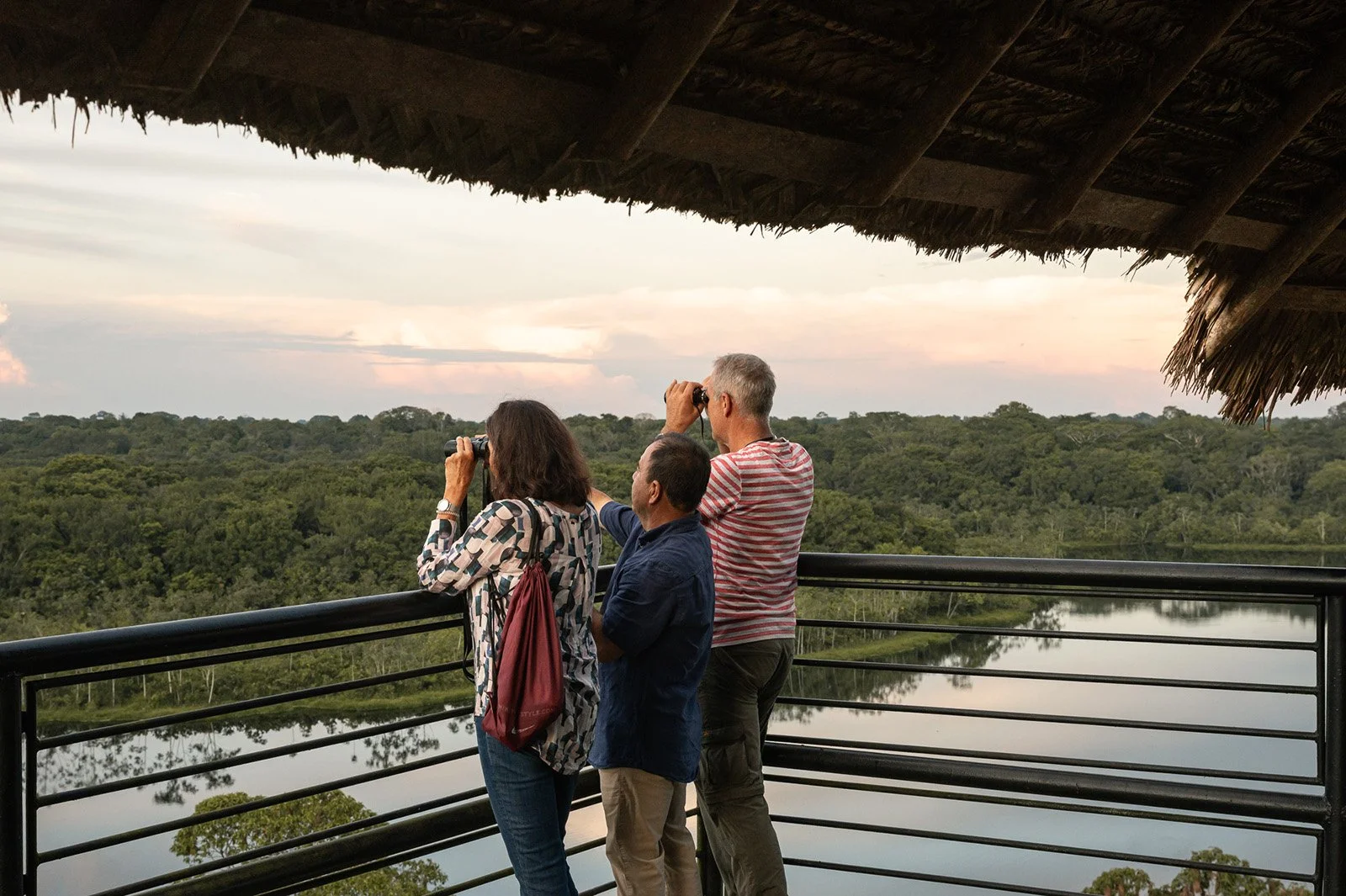 Avistamiento de fauna en la punta más alta del Napo Wildlife Center a 50 m sobre la laguna.